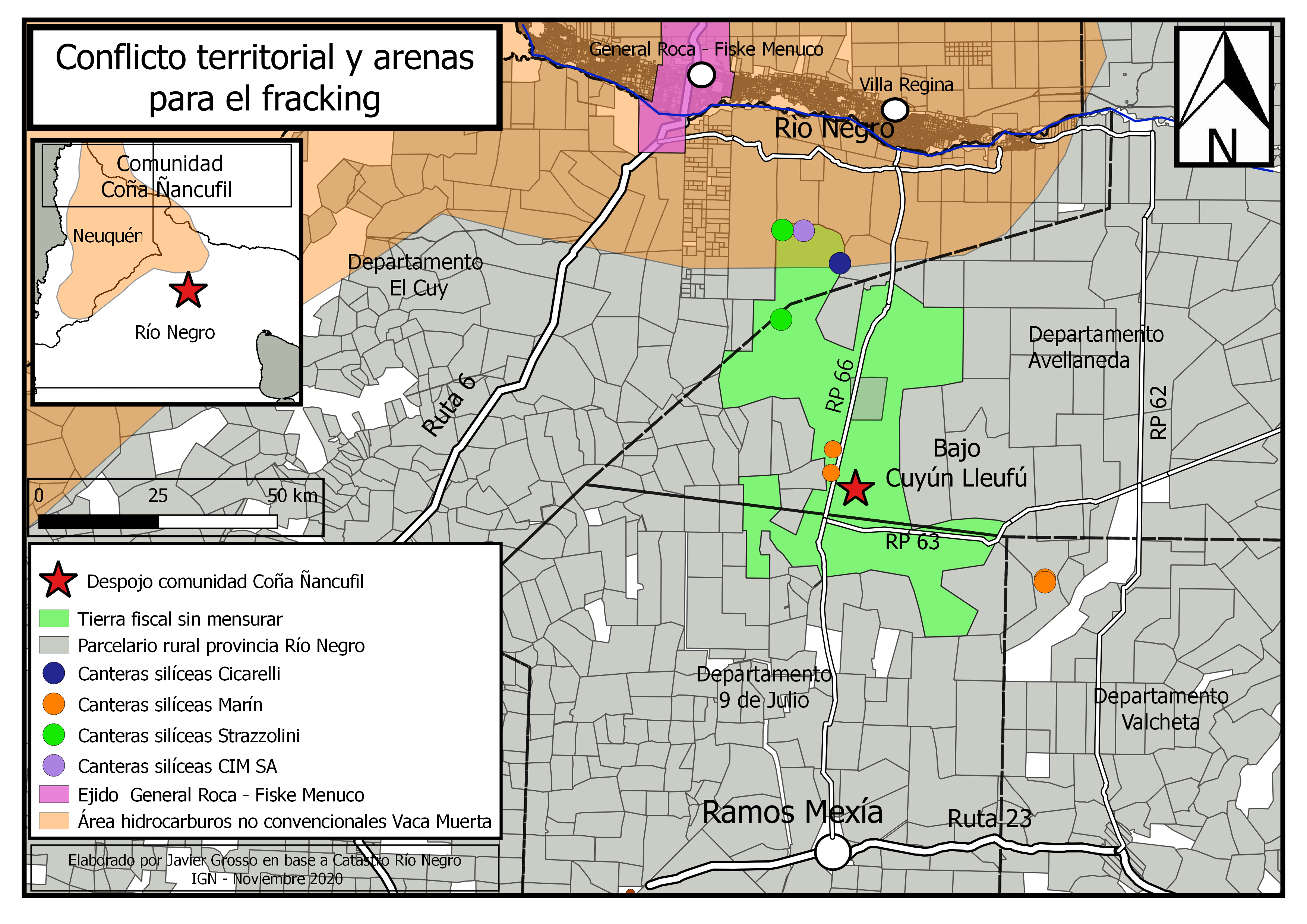 La familia Coña Huenchufil fue despojada de 6.000 hectáreas en el bajo de Cuyún Lleufú, a unos 77 kilómetros al sur de Villa Regina, la localidad más próxima sobre el curso del río Negro. Ese campo contiene varias de las canteras de arenas silíceas propiedad de Daniel Marín, productor minero local cuya trayectoria ascendente relatamos el año pasado https://www.elcohetealaluna.com/arenas-movedizas/. Sin detalles, el conflicto fue planteado en la mesa de diálogo de Viedma como uno de los que está dentro del área de proyectos mineros que requieren la consulta libre, previa y debidamente informada prevista en el Convenio 169 de la Organización Internacional del Trabajo (OIT), que Argentina se comprometió a cumplir.