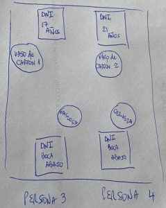 Dicho todo esto, usted se acerca a una de las mesas en donde están comiendo cuatro personas y observa lo siguiente[4]: una está tomando una bebida gaseosa (persona 3) ya que tiene una copa de cristal en la mano y está a punto de beber y hay otra que también tiene una copa de vidrio transparente y usted puede determinar que el líquido es cerveza (persona 4). Señalo en principio estas dos porque ambas, como se ve en la Figura 2, tienen el documento de identidad ‘hacia abajo’ por lo que usted no puede decidir sin levantarlos y darlos vuelta, si son mayores de edad (o no). Puede decidir lo que están tomando, pero no sabe las edades.