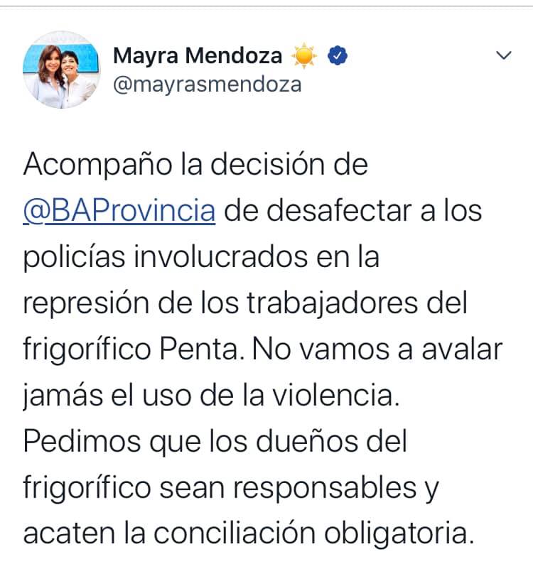 La intendenta puso las pelotas en su lugar: “No reprimir” y “que los dueños del frigorífico acaten la conciliación obligatoria”. Lo posteó en sus redes sociales durante la misma tarde del jueves.