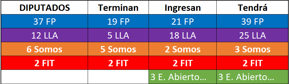 En la Cámara baja, varias agrupaciones tienen legisladores que terminan su mandato sin que haya una clara y directa renovación (salvo en el caso de la Izquierda). Los demás partidos tienen la posibilidad de formar bloques a consecuencia de nuevos alineamientos.