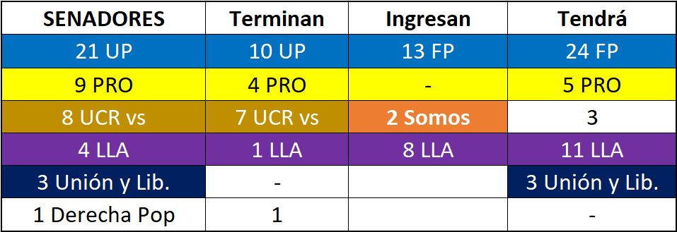 En la Cámara Alta, de los 23 asientos con recambio, Fuerza Patria accederá a 13, La Libertad Avanza a 8 y Somos a 2.