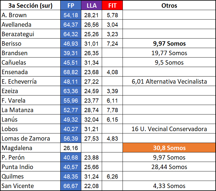 De los distritos de la Tercera, Fuerza Patria sólo quedó segundo en Magdalena, donde ganó Somos (UCR) y quedó tercero el vecinalismo del Espacio Pensamiento y Acción Magdalena. Somos quedó entre los tres más votados en seis distritos, con más de 28 puntos en Punta Indio y casi veinte en Brandsen. Arañó los diez en Cañuelas y Presidente Perón.