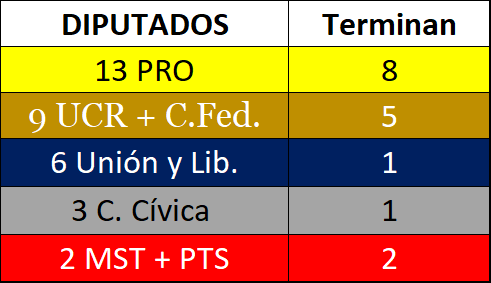 El peronismo tiene 37 diputados, de los cuales renueva 19. O sea que gana dos bancas. La Libertad Avanza perdía 5 de 12 bancas, pero con los 18 nuevos, más que duplica su espacio. En el PRO, terminarán 8 de 13. UCR + Cambio Federal ponía en juego 5 de 9. De Somos se iban 5 de 6. Quedará con 3. Unión y Libertad pierde uno de sus 6. La Coalición Cívica pierde 1 de 3. Los monobloques del MST y el PTS terminaban sus mandatos, pero la Unidad de la Izquierda revalidó otro par de bancas.