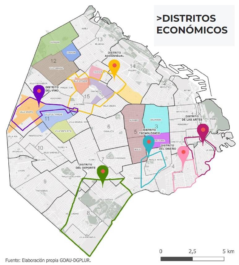 La ciudad cuenta con los Distritos Tecnológico, de las Artes, del Diseño, del Deporte, Audiovisual y del Vino. Aquí se debe agregar la Ley N.º 6508 de Transformación del Área Céntrica de la Ciudad de Buenos Aires, una especie de distrito para los proyectos de reconversión.
