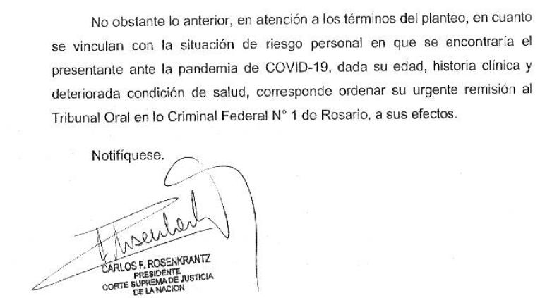 Como la decisión de Amelong es meramente jurisdiccional, Rosenkrantz no consultó ni se lo comunicó al resto de sus colegas. La resolución en la que le pide al TOCF 1 de Rosario que evalúe la domiciliaria de Amelong la firmó el 1 de abril. Lo curioso es que ese mismo tribunal había rechazado un planteo idéntico cuatro días antes.