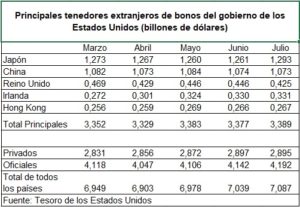 Para completar el combo a favor del dólar, ese motivo de no colisionar las exportaciones se junta con la presión política que los Estados Unidos ejercen, por ejemplo, con una lista de vigilancia de los países que considera manipuladores de divisas. Los especuladores en divisas y los analistas esperan que el dólar caiga fuerte en su cotización global. La caída experimentada de 6% desde marzo para algunos debería cuadriplicarse o quintuplicarse en los próximos años. Esta devaluación del dólar es respecto de las divisas fuertes. Brasil y Argentina en el mismo lapso han visto devaluar sus monedas con relación al dólar. Pero el dilema de sostener el dólar o revaluar ya está tallando y las tenencias extranjeras de bonos del Tesoro de los Estados Unidos crecieron en julio por tercer mes consecutivo, llegando a 7 billones 87.000 mil millones de dólares según datos del Departamento del Tesoro. La fuerte tendencia de compra se ha mantenido incluso cuando China redujo su ritmo de adquisiciones de bonos de años anteriores y cedió su lugar como el principal tenedor extranjero de deuda estadounidense a Japón.