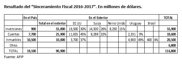 A partir de los datos publicados por la AFIP es posible determinar algunas características relevantes sobre la composición de los activos declarados en esa oportunidad. El primer aspecto destacable es que la mayor parte (U$S 93.300 millones) estaba radicada en el exterior. En segundo lugar, aproximadamente tres de cada cuatro de esos dólares tienen que ver con depósitos en cuentas, inversiones, participaciones en sociedades y derechos (U$S 80.900 millones). Finalmente, del total de esta clase de activos en el exterior, dos países (Estados Unidos y Suiza) concentraban el 63%.