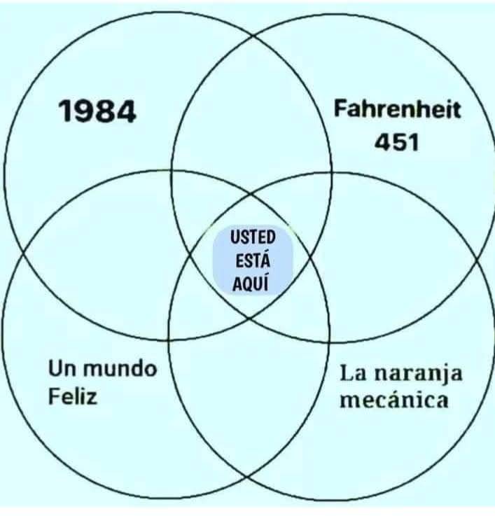 Libro indispensable, un clásico, digno de relectura al menos una vez por década, trae el presente una perspectiva del poder reinante cuyos rasgos y manipulaciones se reciclan en forma constante bajo diversas modalidades de represión, control ideológico e impunidad. Probablemente por eso mismo en las redes antisociales ha surgido un post anónimo que grafica estas contingencias. Valiéndose de los círculos eulerianos con que se imparte en la escuela la teoría de conjuntos, 1984 figura en espacio propio. A su diestra Fahrenheit 451 (Ray Bradbury, 1953), la epopeya de los bomberos quemadores de libros; debajo de éste La naranja mecánica (Anthony Burgess, 1962) novela y film de violencia y sobreadaptación, con Un mundo feliz (Aldous Huxley, 1932), la historia de una sociedad controlada a través de las drogas, a su lado. Y en el centro, en la confluencia del cuarteto, la leyenda “Usted está aquí”.