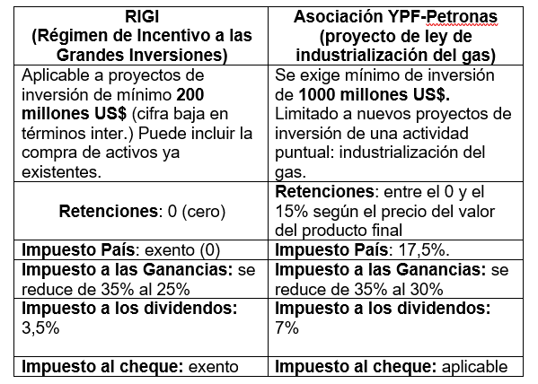 A los fines didácticos, Parrilli mostró un recuadro que contrastaba los beneficios previstos en el RIGI con las particularidades que se le ofrecieron a Petronas para llevar a cabo una iniciativa conjunta de licuefacción de gas (pase de estado gaseoso a líquido) junto a YPF. (Las mismas condiciones se aplicarían a nuevos proyectos de inversión ligados a la industrialización del gas.) Se reproduce el gráfico a continuación: