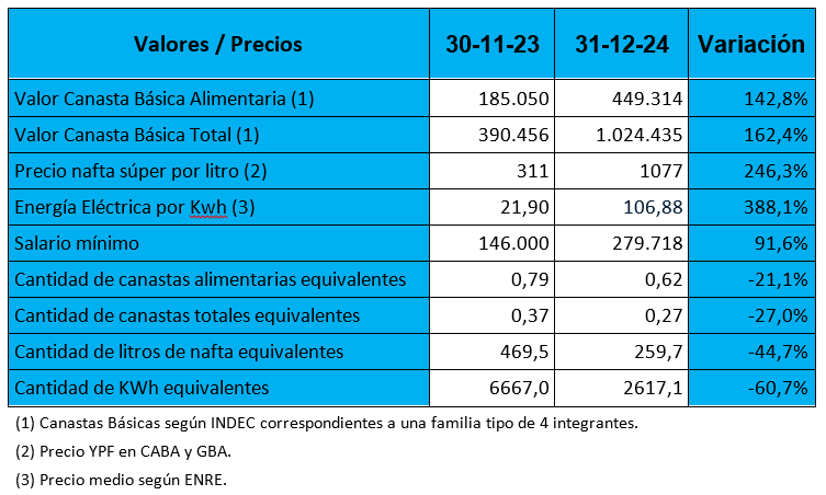 Digo engañosamente porque al comparar la evolución del salario mínimo, que aumentó un 91,6% en esos 13 meses, con los valores de la canasta básica alimentaria, que mide el límite de la indigencia, y de la canasta básica total, que mide el límite de la pobreza, así como la evolución de los precios de la nafta y de la energía eléctrica en igual período, encontramos que la capacidad de compra del salario resulta notoriamente inferior a la que regía hacia fines del gobierno de Alberto Fernández, tal como se demuestra en la siguiente tabla.