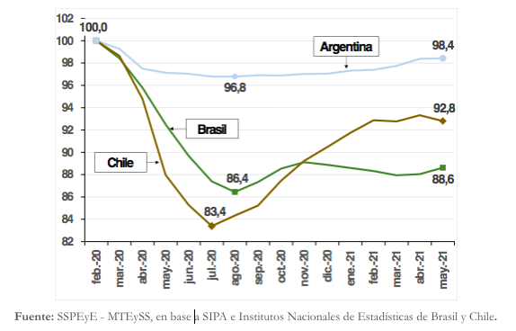 Cuando se analiza todo el período afectado por la irrupción del Covid-19, la Argentina resulta ser el país que perdió una menor cantidad de empleo (1,6%) dado que la economía chilena registra 7 puntos porcentuales menos de empleo y Brasil 11 puntos menos. “La decisión política de preservar las relaciones laborales frente al contexto contractivo es uno de los determinantes principales de que la Argentina sea en la actualidad, uno de los países de la región en que el empleo asalariado registrado privado se redujo en menor medida” concluyeron.