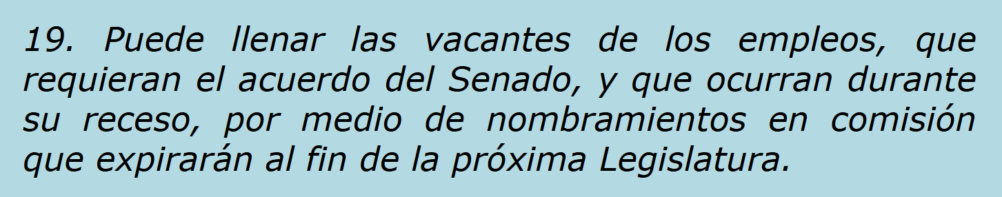 Pero el inconveniente más sustancial nos llega con el alcance que le damos a la frase “llenar vacantes de los empleos que requieran acuerdo del Senado”. Empleo es la forma sustantiva del verbo transitivo emplear, que según la Real Academia Española significa “ocupar a alguien, encargándole un negocio, comisión o puesto”. Conlleva una idea de subordinación. Esta noción se fortalece con la etimología de la palabra. Emplear viene del latín implico que significa enlazar, rodear. Una relación no igualitaria donde hay un enlazado y un enlazador, un rodeado y un rodeador. Cosa impropia de un juez de la Corte Suprema, poder independiente respecto al Poder Ejecutivo Nacional. Es por ello que el artículo 99 inciso 19 aplica para miembros del servicio exterior (embajadores, por ejemplo) u oficiales superiores de las Fuerzas Armadas (un almirante) que, requiriendo aprobación del Senado en su designación, dependen sin embargo y en línea vertical del Presidente de la Nación. Diferente de un juez de la Corte Suprema, integrante del tribunal superior de un Poder de la Nación independiente del Presidente (artículos 1 y 108 de la Constitución Nacional).