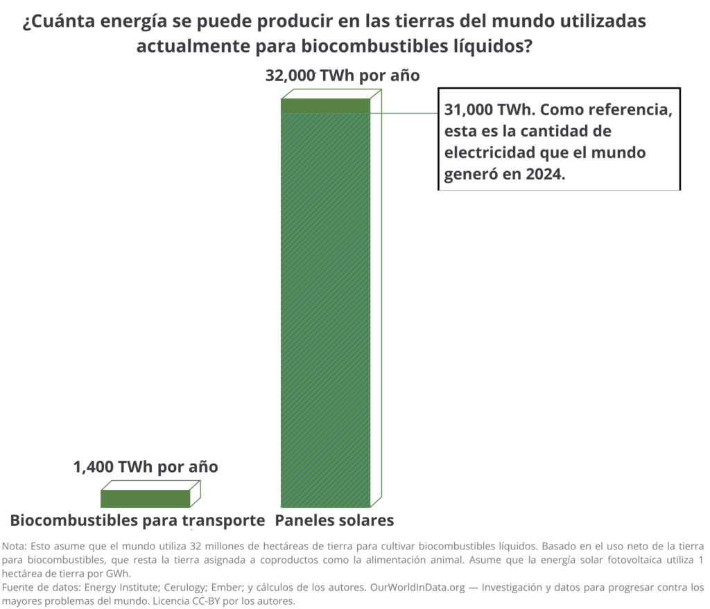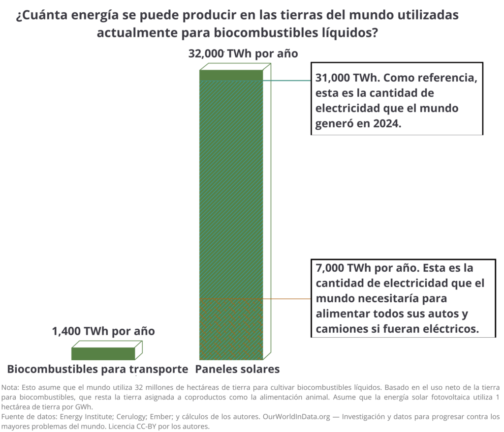 La respuesta es sí. Si instalamos paneles solares en ese terreno, podríamos producir aproximadamente 32.000 teravatios-hora de electricidad al año [7]. Eso es 23 veces más que la energía que se produce actualmente en forma de biocombustibles líquidos [8]. Se puede ver esta comparación en el siguiente gráfico.