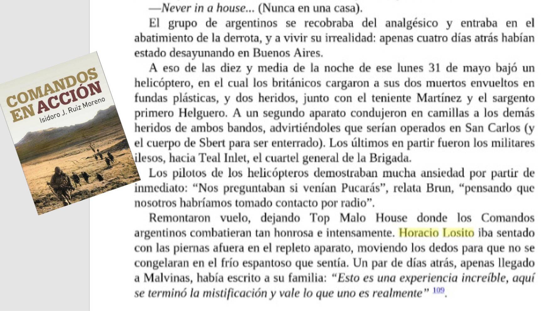 Para diciembre de 1978, con el grado de teniente, Losito fue movilizado a Río Turbio, Santa Cruz, ante el eventual conflicto con Chile. Ya como teniente primero, en 1982 pasó del Regimiento de Infantería 11 de Tupungato (Mendoza) a la guerra, casi al final, el 22 de mayo. Fue segundo jefe de la primera sección en la Compañía de Comandos 602 que llegó a Malvinas dos días antes del 28 de mayo, cuando afrontaría su única misión, ya que sería herido en la cabeza por una esquirla y caería prisionero. Así lo relata, en tono hagiográfico, Isidoro J. Ruiz Moreno: “Apenas cuatro días atrás habían estado desayunando en Buenos Aires”.