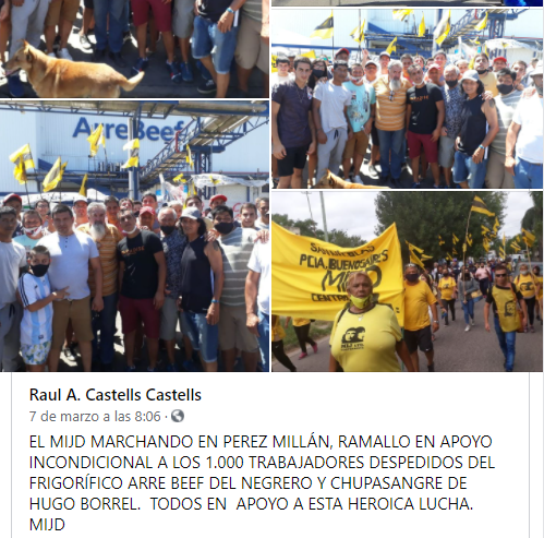 Arre Beef es una empresa de construcción familiar de capital nacional que logró una posición en el mercado mundial, con notables ganancias. Siendo su actividad esencial, no ha dejado de funcionar durante la pandemia. Borrel, con sus 73 años, no estuvo presente en la empresa. Fue su hijo, a quien llaman Huguito para diferenciarlo, quien estuvo al frente. Hay quienes manifiestan que buscó una construcción propia de poder. Por eso, al igual que su padre, que construyó una relación con el sindicalista Luis Pérez, buscó hacerlo con quienes se desprendieron de la conducción sindical de Pérez como Marcelo Cardozo, que integraba la comisión pero fue suspendido, aunque no se concretó ese proceso debido a la pandemia. Cardozo fue quien comenzó a agitar las aguas y a señalar que el mal de los males para los trabajadores era Luis Pérez. Pudo moverse en el frigorífico con esa libertad. En un audio enviado a un trabajador se lo puede escuchar expresando que junto a dos compañeros más se reunieron con Guillermo Villa, gerente de recursos laborales de la empresa, a quien le plantearon poder salir temprano el miércoles para ir al sindicato. Ese miércoles 3 de marzo fue la toma ilegal de la sede sindical. La respuesta de la empresa fue dejarlos salir y cubrirles el día pagando garantía horaria. “Y si llegan a ganar hasta le podemos pagar el día completo”, cita Cardozo la respuesta de Villa. Lo que evidencia que la empresa apoyó el conflicto.