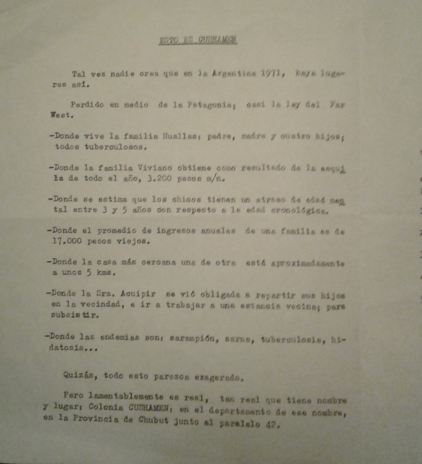 "Este es nuestro último día en Fofo Cahuel y quisiera hacer un resumen del mes, pero no puedo. Sólo se me ocurren palabras sueltas; cantos, guitarra, alpargatas, colchas, zancos, charlas, diapositivas, títeres, doroteo, gimnasia, caminatas, visitas, mate, noche, luna, estrellas, cielo, maestras, guindas, chicos, soledad, viento, frío, blancura, amigos, domingo, misa... Todas éstas y otras más se me pasan por la mente." Mónica Mignone. Cushamen, 1972.