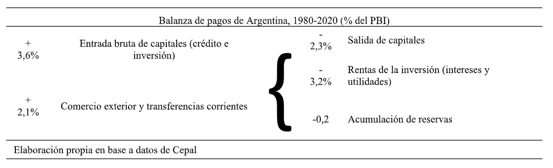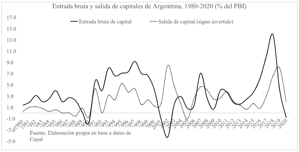 En los últimos 40 años la entrada bruta de capitales del exterior a la Argentina ha ascendido a un promedio anual de 3,6% del PBI. En general, sin embargo, estas divisas emigran en su totalidad. Parte pasa a manos de capitales privados que las emplean para adquirir divisas u otros activos externos. Más aún, cuanto mayor es la entrada de capitales en un período mayor es, en general, la salida.