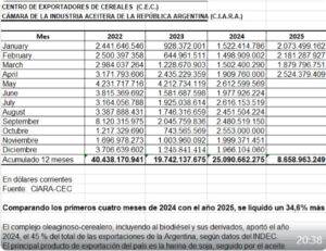 Hasta ahora, el Ministro de Economía Luis Caputo no ha recibido a ningún empresario con un arma sobre su escritorio, pero ha subido varios escalones en la trepada de las advertencias y las amenazas a productores de alimentos y artículos de limpieza, y ahora también a fabricantes de automóviles. Un dato fundamental a favor del gobierno es que en el primer cuatrimestre la liquidación del complejo oleaginoso superó casi en un 35% la de un año atrás, lo cual sugiere que la suspensión hasta junio de los niveles de las retenciones ha dado resultados. Así lo informaron las Cámara respectivas, CIARA-CIEC.
