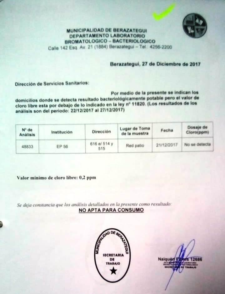 El Ministerio de Salud de la Provincia se expidió: “De los pozos empleados para la provisión del servicio de agua potable a cargo del Municipio de Berazategui, se han hallado parámetros fuera de los límites admitidos”. El Poder Judicial de la Provincia, en base a muestras de septiembre de 2015 al mismo mes de 2016, dictaminó que el agua no era potable en esos lugares.