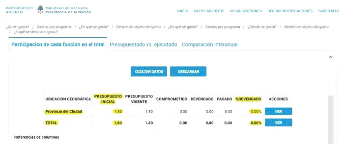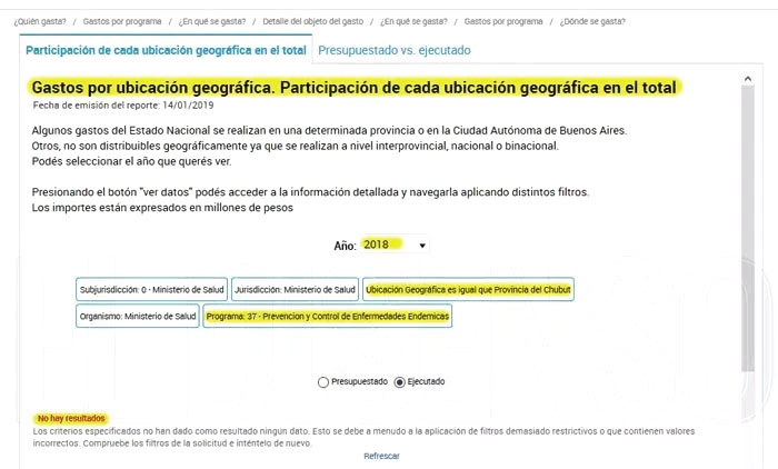 En lo que hace a la partida asignada por Nación a la provincia de Chubut para prevenir las enfermedades zoonóticas, en el año 2017 se asignó la suma de $1.800.000. Al 31 de diciembre de 2017 la subejecución era del 100%: el gobierno no ejecutó ni un centavo. Para 2018 Chubut fue eliminada del listado de provincias con presupuesto asignado desde Nación.