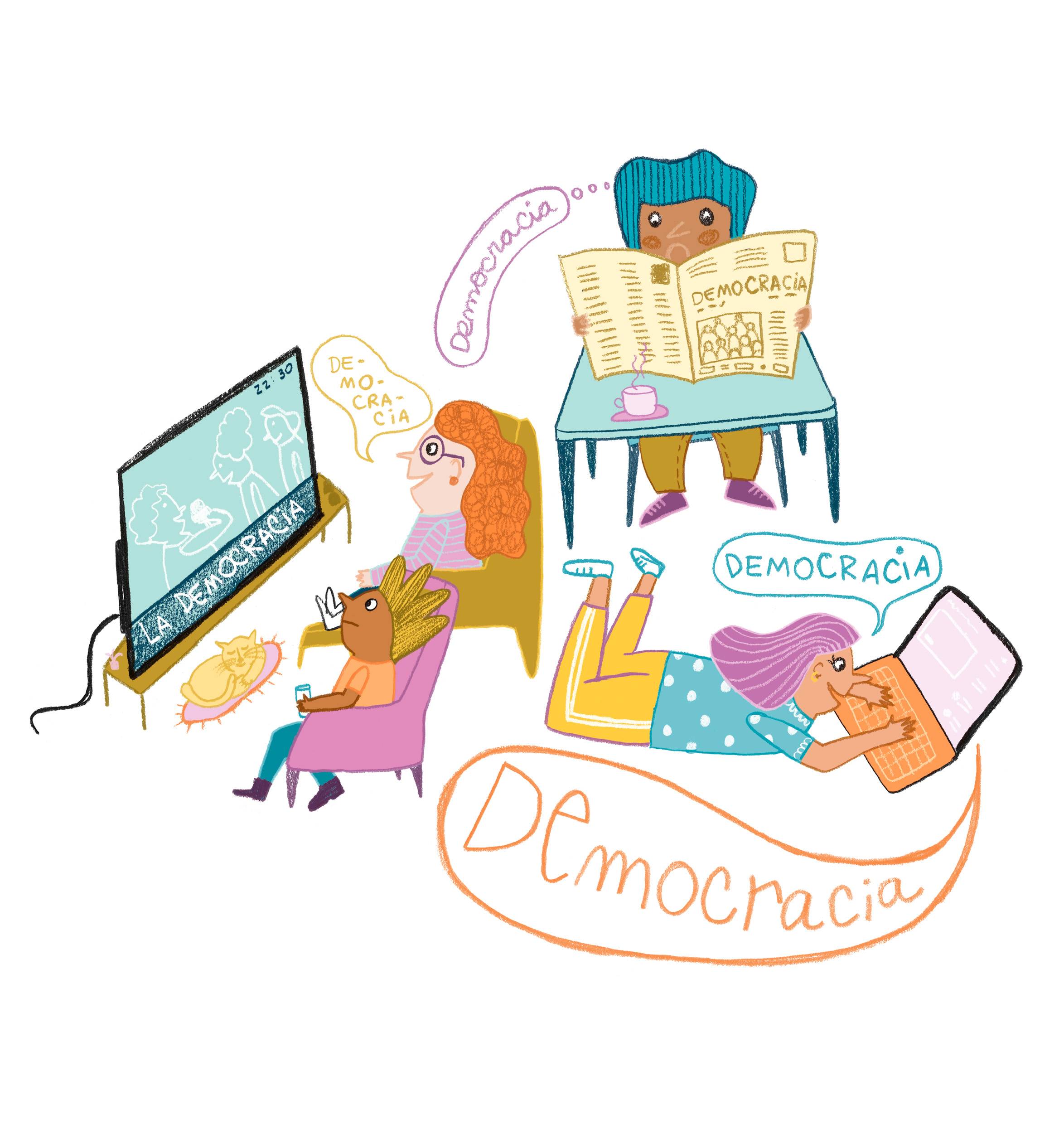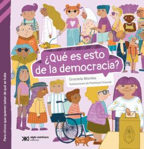 Con encantadoras y coloridas ilustraciones de la artista Penélope Chauvié (Bahía Blanca, 1989), como en la edición de hace cuatro décadas, ¿Qué es esto de la democracia? está pensado –con singular rigor—, construido y realizado para pibes de escuela primaria, a través de un desarrollo dialógico, inaugurado por la inquietud de quien participa al escuchar en el hogar, en las redes, en todas partes, hablar de democracia y quiere saber de qué se trata. A tal fin, el libro pivotea desde el inicio mismo en la noción general de pueblo, esa categoría donde “nadie queda afuera”, en la que “nadie tiene coronita”. Concepto popular con el cual la autora plantea la equidad entre derechos y obligaciones, para retrotraerse a los regímenes monárquicos y sus privilegios, arbitrariedades y latrocinios. Ante cada noción, la autora desenvuelve un apólogo; en este último caso el de “sangre real”. ("De ‘realeza’, no de ‘realidad’, porque igual de reales y de verdaderas son todas las sangres”). Y refuerza con color: “Como no trabajaban en los campos ni soportaban el viento frío del invierno ni el sol quemante del verano, tenían la piel tan blanca y fina que se les traslucían las venas”. Luminoso cierre que un niño puede corroborar en su propio cuerpo; transforma el saber abstracto en experiencia personal.
