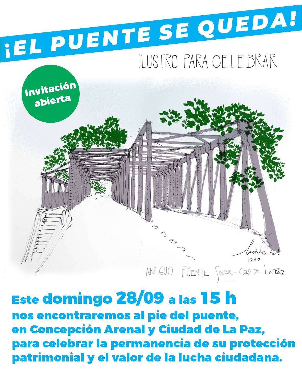 Hoy domingo 28 de septiembre a las 15 se invita a la ciudadanía al pie del puente en Concepción Arenal y Ciudad de la Paz, para celebrar la permanencia de su protección patrimonial y el valor de la lucha ciudadana.