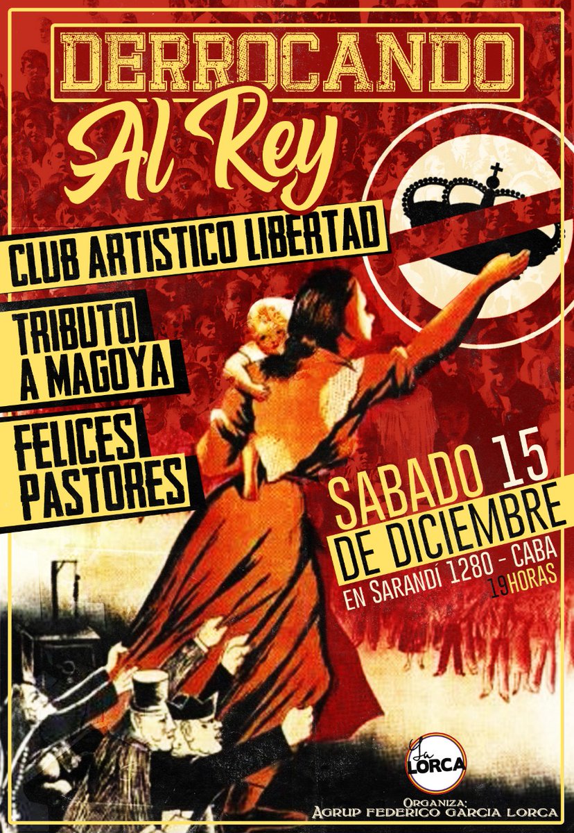 El sábado 15 de diciembre, a las 19, quienes integramos la agrupación Federico García Lorca (colectivo de españoles, argentinos e hijos y nietos del exilio), realizaremos en el Espacio Cultural Campustellae, Sarandí 1280, CABA, el festival “Derrocando al rey” con las actuaciones de Club Artístico Libertad, Felices Pastores y Tributo A Magoya. Además se leerá el manifiesto “No a la monarquía”: http://lalorca.com.ar/manifiesto.php. Quienes quieran adherir al mismo podrán realizarlo por correo electrónico a [email protected]
