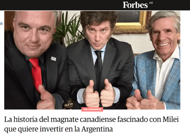 "Días antes de la asunción de Milei en diciembre, hablaron directamente por primera vez y Musk preguntó sobre el litio de la Argentina. En los meses posteriores, Milei ha estado impulsando una legislación que haría mucho más atractiva la extracción del litio argentino para los inversores extranjeros. Su proyecto de ley, que le otorgaría amplios poderes de emergencia sobre la economía y la energía de la Argentina durante el próximo año, incluye un beneficio importante para Tesla: importantes incentivos para los inversores extranjeros en grandes proyectos, particularmente en minería. (...) Es probable que el proveedor de litio de Tesla califique. De ser así, el plan de Milei le daría a Tesla una estabilidad y previsibilidad inusuales en su acceso al litio en la Argentina hasta al menos 2054” (traducción propia).