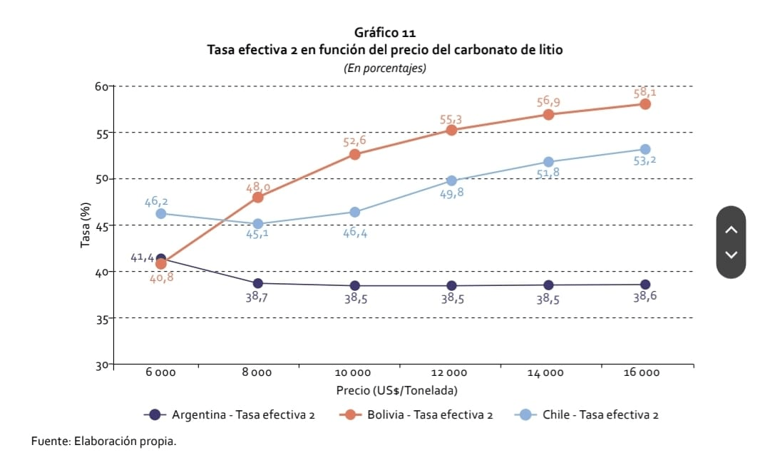 - La tasa efectiva sobre precio de carbonato de litio en la Argentina es menor que en Chile y similar a la de Bolivia, a 6.000 dólares la tonelada de carbonato, y luego con el mayor precio por tonelada en la Argentina es incluso menor, mientras que en Chile y Bolivia es creciente.