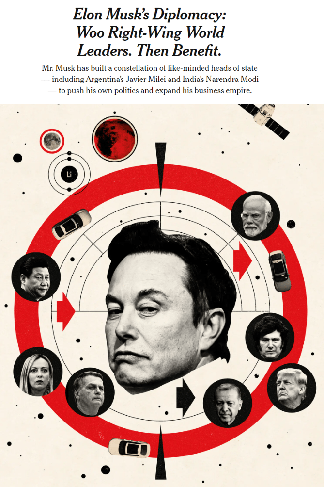 El rumbo del gobierno de Milei va a contramano de escalar en la cadena del litio. Un claro ejemplo de esta campaña de expoliación lo brinda la empresa Tesla. O, mejor dicho, su dueño Elon Musk. En el New York Times, los periodistas Ryan Mac, Jack Nicas y Alex Travelli escribieron La diplomacia de Elon Musk: alentar a líderes mundiales de derecha, después beneficiarse. Allí sostienen: