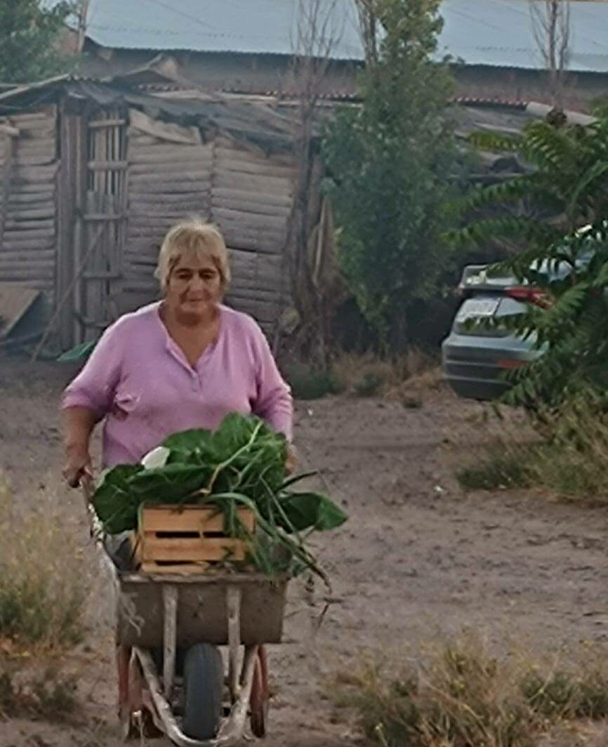 De las mil cien personas que habitan esta colonia, la mitad es adulta mayor y la otra mitad son niñxs y adolescentes. Un centenar es de la población original. Un abuelo de 89 años produce alfalfa alrededor del tanque australiano. La familia Olagaray mantiene una huerta inmensa, con frutales y gallinas ponedoras, produciendo unas reconocidas canastas orgánicas. En el caso de la familia Panero, comparten dos hectáreas entre cuatro familias para la cría de chachos, gallinas, vacas, chivos y frutales. Este año no pudieron hacer huerta todavía por falta de agua.