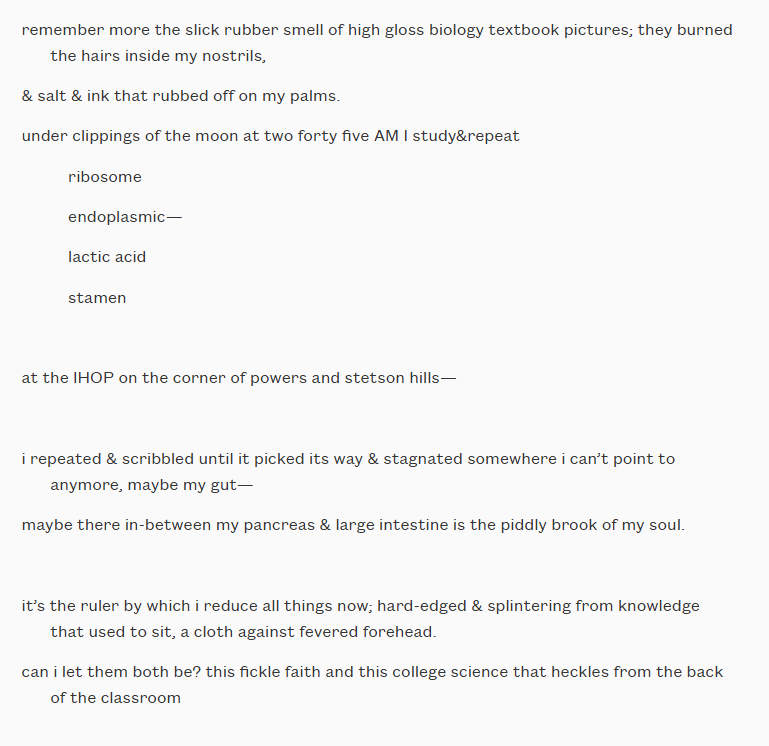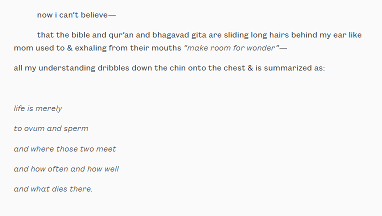 ahora no puedo creer que la Biblia, el Corán y el Bhagavad Gita me deslicen el pelo largo detrás de la oreja como solía hacerlo mamá y exhalen por la boca “hagan espacio para la maravilla”.