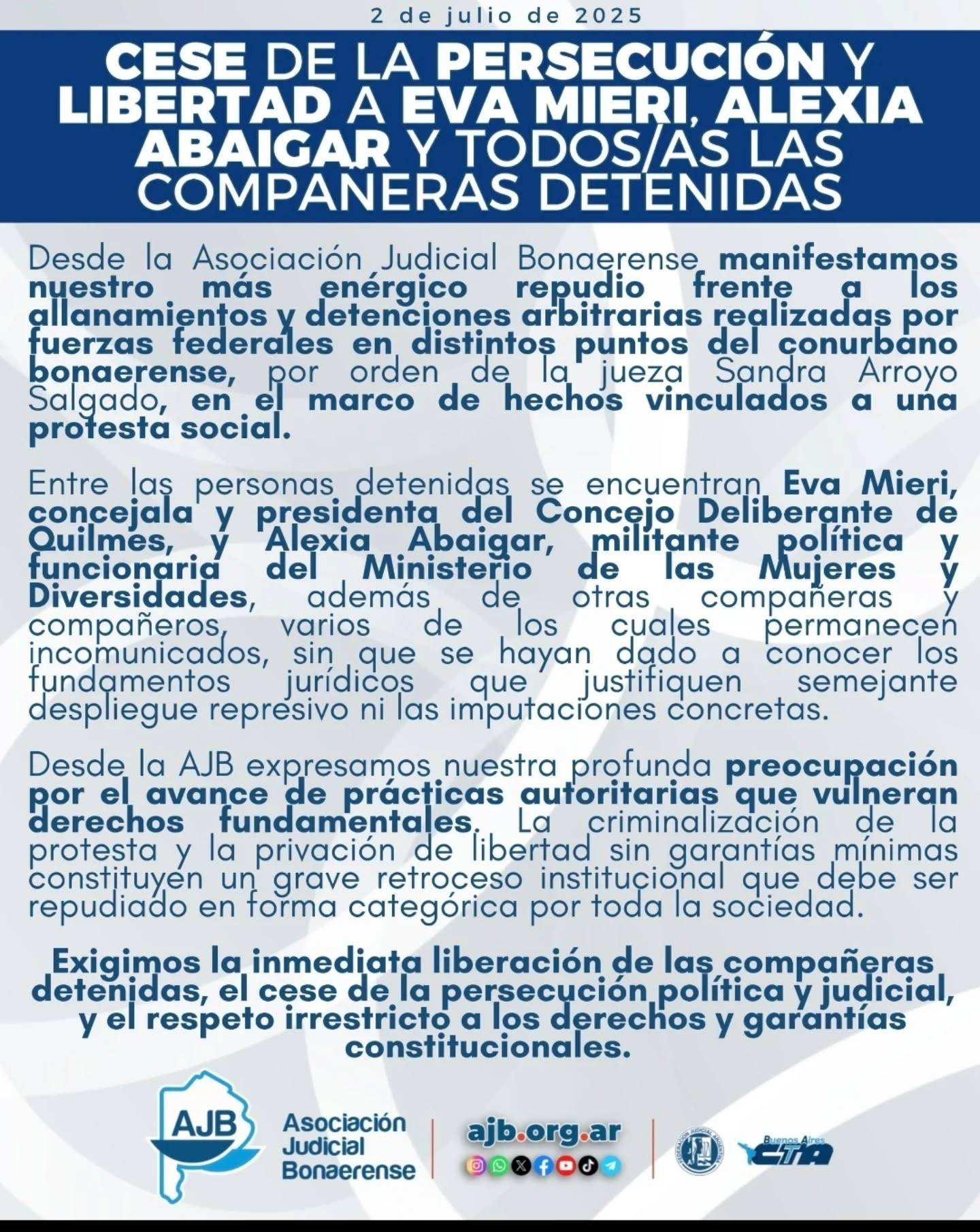 Este miércoles 2 de julio, horas después de que los peronistas asistieran a actos recordatorios por la muerte de su líder, cuatro militantes fueron detenidos bien temprano en sus casas de Quilmes, Florida, Villa Martelli e Ingeniero Maschwitz. Una de las tres incomunicadas es Eva Mieri, concejal de Quilmes, donde gobierna Mayra Mendoza. Al cierre de esta edición, Abaigar había obtenido el arresto domiciliario por problemas de salud y el resto de los militantes había recuperado la libertad, excepto Mieri, que según Arroyo Salgado “podría eludir la acción de la justicia y entorpecer la investigación” en caso de ser liberada.