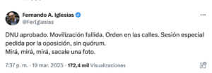 En realidad, no es lo único que festeja el oficialismo. En un tuit asombroso, aun para el generoso estándar al que nos tiene acostumbrados, Fernando Iglesias —experto en globalización— se felicitó por el nuevo préstamo impagable que heredarán nuestros hijos, pero también por no haber dado quórum para tratar la continuidad de la moratoria jubilatoria (que vence hoy) y la entrega de medicamentos esenciales a los jubilados.