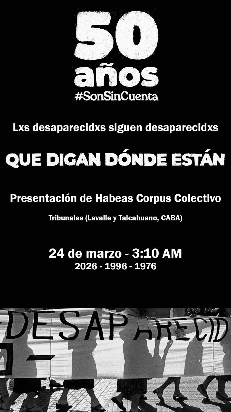 Treinta años después, 358 sentencias y 1.200 condenados mediante, el colectivo #SonSinCuenta, compuesto por hijxs de personas secuestradas-desaparecidas y/o asesinadas durante la última dictadura y los años previos, volverán a presentar un hábeas corpus colectivo, para reclamar información completa sobre lo sucedido con sus familiares. “50 años después, no sabemos dónde están y qué sucedió con ellxs”, explican en su convocatoria. La cita es el martes a las 3.10 am, a medio siglo del momento en que se inició el golpe de Estado, en las escalinatas del palacio de Tribunales, en Talcahuano y Lavalle.