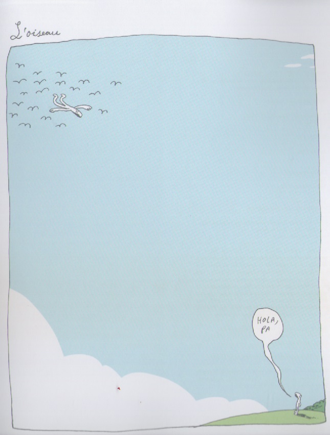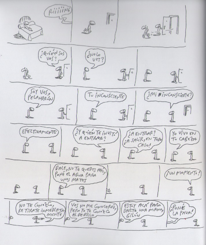 Da unas vueltas, se quiebra un poco, promete no ser complaciente consigo mismo y junta sus pedazos y vuelve a arrancar cuando irrumpe su inconsciente, en persona, en vivo y en directo. Se trata de un personaje faliforme, igual a él, resuelto en escasas líneas, negro sobre blanco. Otra aventura comienza, la de la evocación que recorre las ciento sesenta y tantas páginas, grueso papel, 20 x 23 cm, medio kilo de libraco en el que se dibuja la angustia para transformarla en otra cosa, mejor. Tute y su inconsciente revolotean sobre Buenos Aires hasta relanzar otra vez la historia mediante un renovado principio en el que el protagonista sale de un huevo. Viaje en el tiempo dentro de una familia peronista, de la que formaba parte Clemente, el inmortal invento del papá.