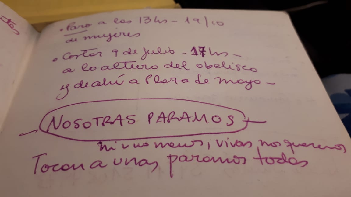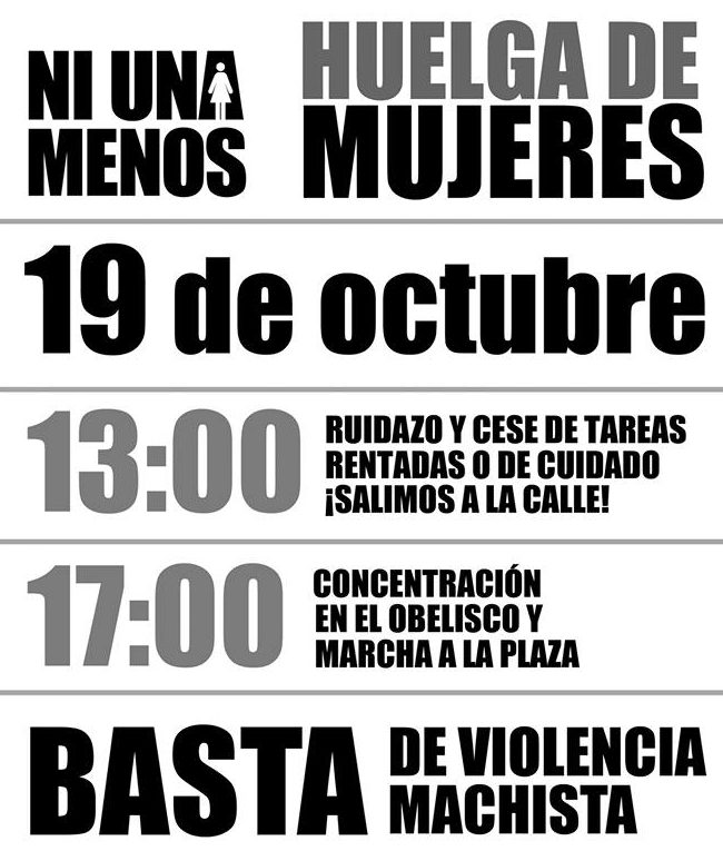 Ese día, el 13 de octubre, se declaró el primer Paro Nacional de Mujeres y se fijó la convocatoria: el 19 de octubre a las 13 paro en todos los lugares de trabajo, incluidas las casas, y a las 17 corte de la Avenida 9 de Julio a la altura del Obelisco y marcha hacia la Casa Rosada. Quedaban 5 días para organizarlo. Una de las oradoras sostuvo que se estaba disputando la idea del paro “a los cinco tipos que están negociando todo el tiempo con el gobierno”.