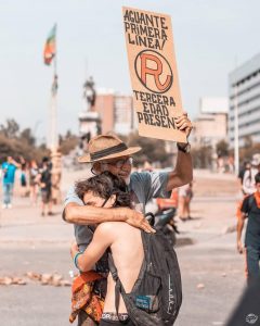 Al frente de las protestas va una “Primera Línea” de jóvenes que llegan desde la periferia, encapuchados y armados de piedras y proyectiles de todo tipo para resistir y responder a la represión de los carabineros en su tarea de defender a los más que millares de manifestantes, coreutas y músicos, pobladores pobres y de clase media, gente de tercera edad, niños y artistas, con sus carteles y sus banderas mapuches y sin partido. Las escaramuzas han ido formando también una “Segunda Línea” de rescatistas y equipos sanitarios, aguateros y proveedores de proyectiles. Tienen centenares de lásers con verdes luces que apuntan y enceguecen a los comandos represivos . Y sprays de pintura para dejar su huella.