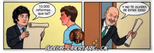 Seguro de que así atrae a los votantes más ingenuos, también lanzó otro comic, en el que Federico Sturzenegger le acerca una nómina de las reformas realizadas, con las que Milei abruma a un joven iracundo.