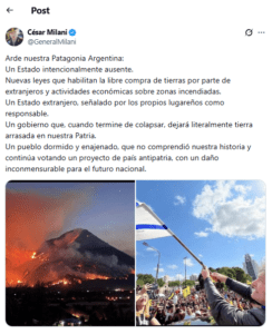 La quemazón de Chubut atrajo a otros especímenes. El ex jefe del Ejército entre 2013 y 2015, César Santos Gerardo del Corazón de Jesús Milani, publicó un correcto texto patriótico sobre la ausencia del Estado, pero dijo que era responsable del fuego "un Estado extranjero", y lo ilustró con una foto de Milei enarbolando la bandera de Israel, cuyo gobierno está cometiendo Crímenes de Lesa Humanidad en Gaza. Aun con mayor precisión pero no con mayor fundamento, una periodista de la radio Diez dijo que dos israelíes eran los causantes del fuego. Luego de ser desmentida, Marcela Feudale se disculpó, dijo que se había confundido y que no tenía ánimo discriminatorio.