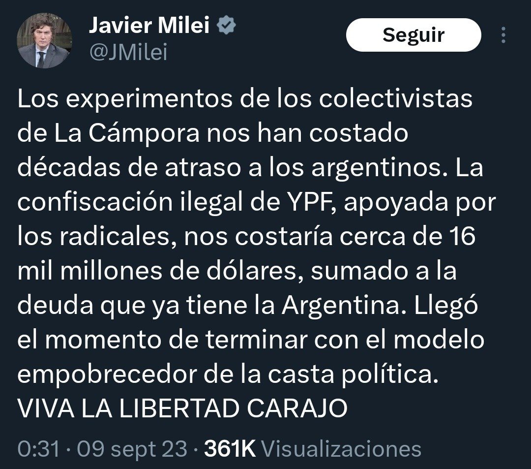Lo notable es que el oficialismo y sus adláteres mediáticos y económicos festejaron el fallo como un éxito propio. “Tuvimos que venir a arreglar las cagadas que hizo el inútil, imbécil, incompetente de Kicillof durante el segundo gobierno de la corrupta y presidiaria Cristina Fernández de Kirchner” afirmó el Presidente de los Pies de Ninfa en su lenguaje de matón de salita azul. En realidad, el fallo convalida no sólo la expropiación del 2012, sino la estrategia de defensa establecida por CFK, Axel Kicillof, el ex procurador del Tesoro Carlos Zannini y el ex procurador adjunto Sebastián Soler, y seguida con buen criterio por los técnicos actuales de dicha dependencia. Milei, como la mayor parte de la runfla financiera, denunció la expropiación por considerarla una “confiscación ilegal”, es decir, convalidó el reclamo buitre.