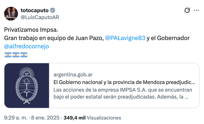 El Vector resultó demasiado caro para ser comercializado, pero, así como Brasil capitalizó esa experiencia, la Argentina sólo asumió pérdidas. Cuando algunos técnicos solicitaron al gobierno fondos para el desarrollo aeronáutico, Domingo Cavallo, el entonces ministro de Economía, les contestó que si tenían proyectos tan buenos, que se los vendieran al Citybank. La bravuconada ilustra una letanía tenaz de nuestra derecha, hoy extrema derecha, que consiste en calibrar el interés de la ciencia y la tecnología para la Argentina en base a un criterio inmediato de ganancia empresarial, obviando las implicancias de largo plazo de este tipo de proyecto para el desarrollo del país. Finalmente, en julio de 1995, la norteamericana Lockheed Martin Corporation, el mayor contratista de armas del Pentágono, adquirió la Fábrica Militar de Aviones; operación habilitada por un oportuno decreto del Presidente Carlos Menem. El valor estratégico de dicha empresa fue denostado por aquel gobierno, que la redujo a un simple costo; como ocurrió hace unos meses con IMSA (anteriormente Industrias Metalúrgicas Pescarmona S.A.), empresa recuperada por el Presidente Alberto Fernández, y primera privatización bajo la gestión de Milei. IMSA fabricaba –entre otros equipamientos– turbinas, torres eólicas, y reactores de abastecimiento, elementos fundamentales para los sectores de energía hidroeléctrica, solar, eólica y nuclear. Al igual que la empresa aeronáutica, la empresa metalúrgica fue vendida por monedas. “Privatizamos IMSA”, se jactó el ministro Caputo, el Timbero con la Nuestra, en su cuenta de Twitter; con un tono similar al usado por su antecesor Cavallo hace tres décadas con la venta a precio vil de nuestra empresa aeronáutica.