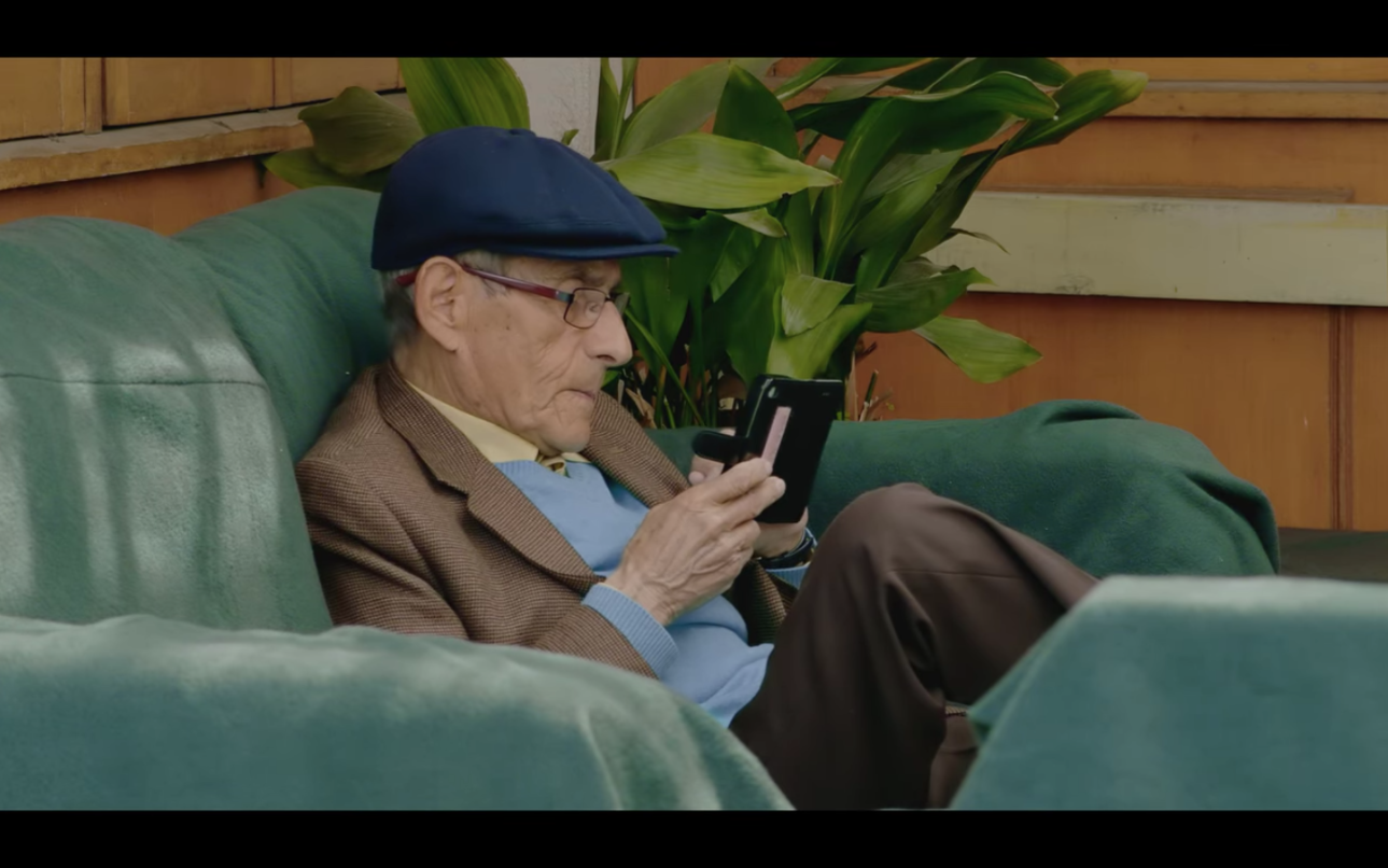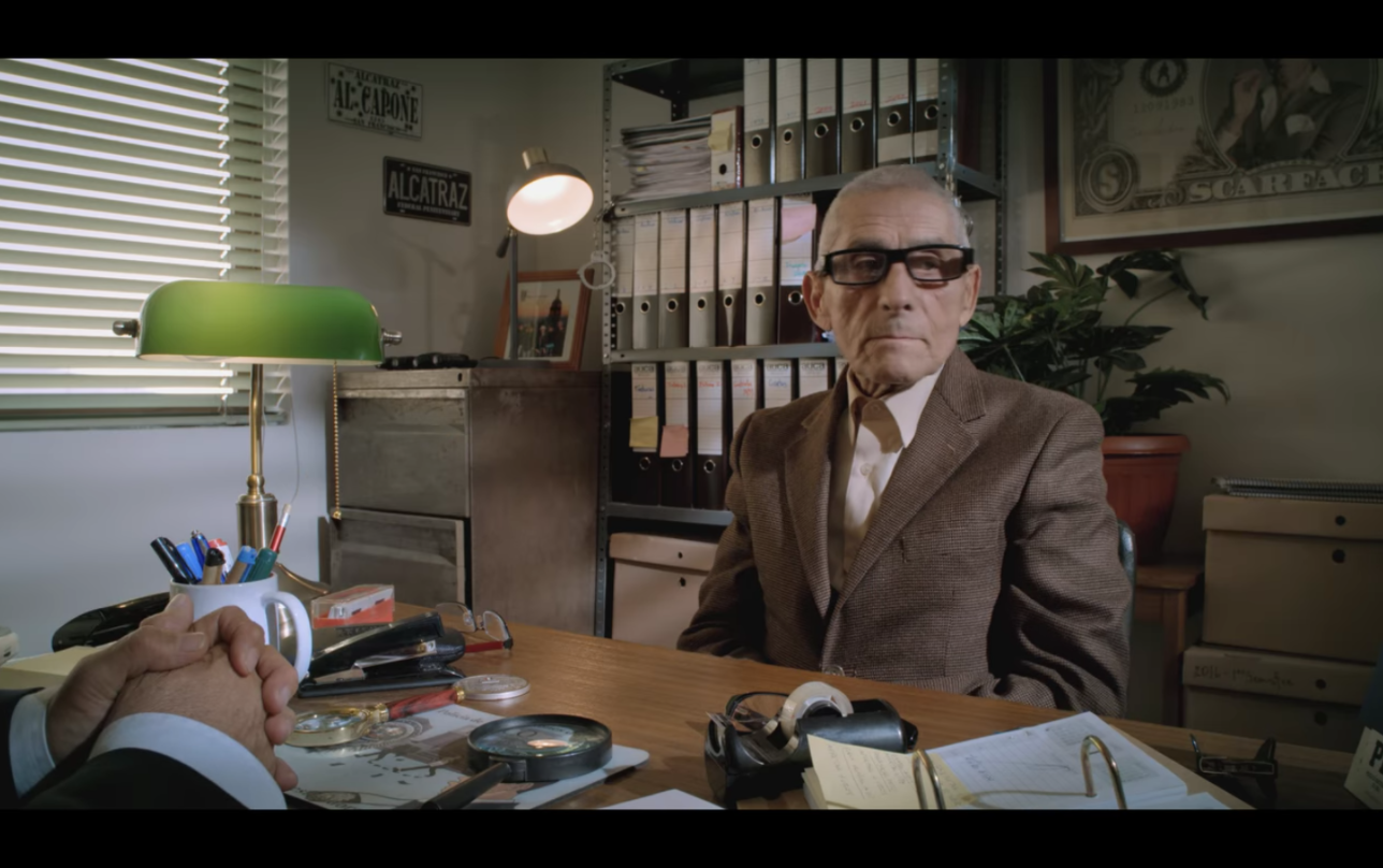 El documental se vuelve en un principio un juego de espías, acompañado de una banda sonora que nos recuerda a ese tipo de ficciones. Se prepara al personaje, se le da unos lentes que tiene una cámara para que filme lo que verá dentro del geriátrico y una lapicera que en realidad es un micrófono, que llevará en la solapa del saco. Lo transforman en agente y así ingresa.