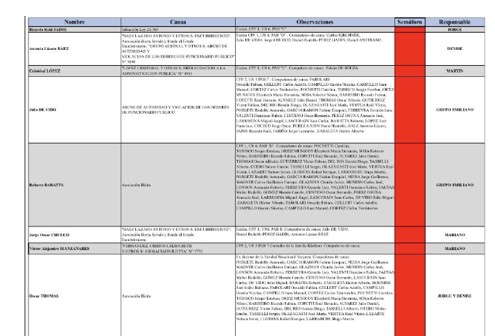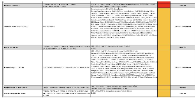 Entre los mencionados en la planilla estaban Lázaro Báez, Ricardo Jaime, Juan Pablo “Pata” Medina, Fabián de Sousa, Cristóbal López y Julio De Vido entre otros. También estaba monitoreado el ex jefe del Ejército César Milani, entonces preso por dos causas de crímenes de lesa humanidad. En su caso, el gráfico mencionaba a las visitas y sus vínculos. Todos los presos habían pasado por los pabellones del IRIC, un invento del macrismo para preparar las cárceles para la llegada de los políticos y empresarios kirchneristas y que la actual interventora María Laura Garrigós desactivó poco después de llegar.