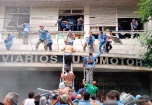 Sin ninguna admiración por el escuálido liderazgo del ex secretario de Organización, varios centenares de activistas llegaron al edificio de la calle Moreno acompañados por una tropa de diplomáticos de buen tamaño y mano pesada. La Infantería policial contemplaba sin actuar hasta que los heridos de gravedad por disparos, machetazos y contundentes manoplas salpicaron de sangre todo el frente del edificio. Mientras, colectivos de todos los recorridos llegaban a los alrededores con nuevos grupos de trabajadores.