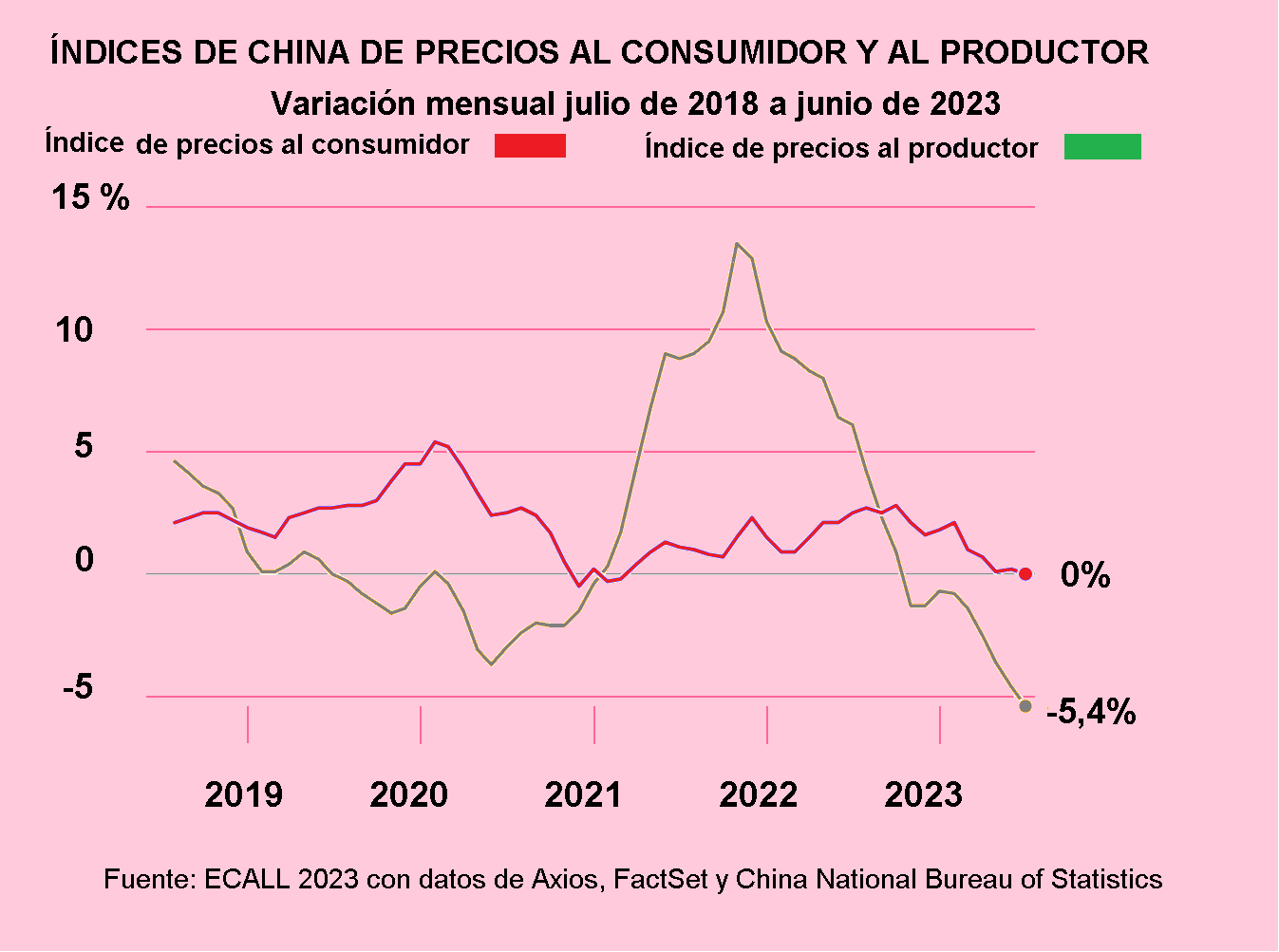 El índice de precios al consumidor de China no registró cambios durante el último año: 0%. Los precios al productor (precios en la puerta de la fábrica, generalmente vistos como indicador principal de los precios al consumidor) son profundamente negativos: cayeron un 5,4% en comparación con junio de 2022. Con deflación (caída de los precios), el crecimiento económico se frena porque las compras de consumo e inversión se posponen a la espera de que se abaraten más, lo que retroalimenta la falta de inversión, por el achicamiento del mercado. Las deudas se vuelven mucho más pesadas y difíciles de pagar.