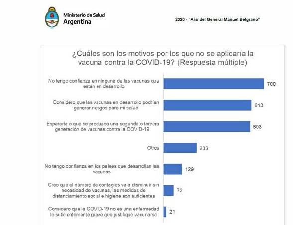 Entre las principales razones dadas para no hacerlo se encontraron: "No tengo confianza en ninguna de las vacunas que están en desarrollo", "considero que las vacunas en desarrollo podrían generar riesgos para mi salud", y "esperaría a que se produzca una segunda o tercera generación de vacunas contra Covid-19".