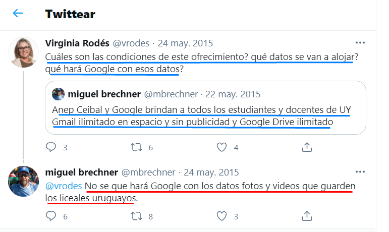 En 2015 la docente Virginia Rodés le preguntó al fundador y entonces presidente de CEIBAL, Miguel Brechner, qué haría Google con esos datos, y su respuesta fue que lo desconocía.