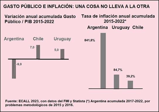 En este aspecto, la fantasmagoría del Caputazo se va a enfrentar con la realidad de que el aumento del gasto público no se conjuga con el aumento de la inflación. En efecto, la inspección del gráfico en el que se plasma la variación en el nivel del gasto público y la variación en tasa de inflación de la Argentina, Chile y Uruguay ocurrida en el lapso 2015-2022 es botón de muestra que pone en evidencia que no hay relación entre ambas variables. Irónicamente, para contrariedad de los monetaristas ramplones (no hay de otro tipo), los datos graficados sugieren lo contrario en la relación nivel de inflación-nivel de gasto público.
