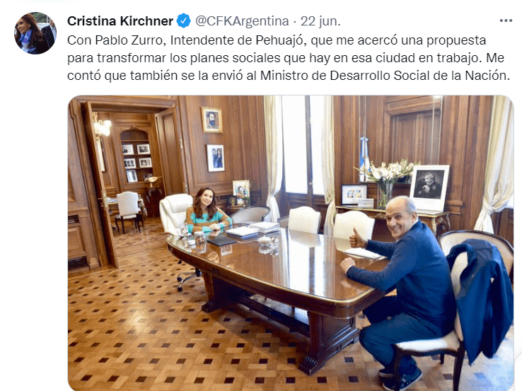 Con respecto a cómo fue recibida su propuesta y si tuvo contacto con el ministro Zabaleta, respondió que “fue enviada al ministro de Desarrollo Social de la Nación a través de personal de la cartera para ver si podemos llegar a un acuerdo”. Se sintió muy conforme por haber sido recibido por la Vicepresidenta: “Le gustó y lo tuiteó. Estoy muy contento porque ella lo avaló”.